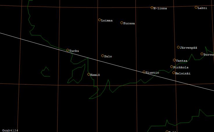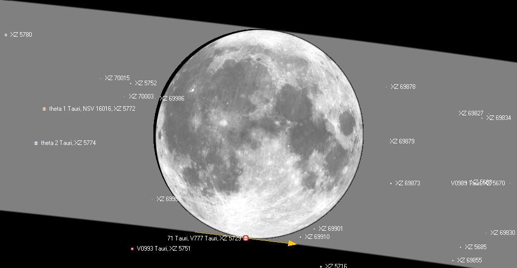 71 Tauri (ZC 0661, 4,5 mag) sivuaa Kuun eteläistä reunaa Turun ja Siuntion kautta kulkevan viivan kohdalla.