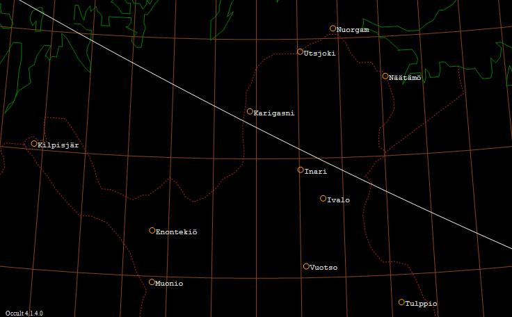 Tähti ZC 0672 (6,7 mag) sivuaa Kuun pohjoista reunaa Karigasniemen ja Nellimin kautta kulkevan