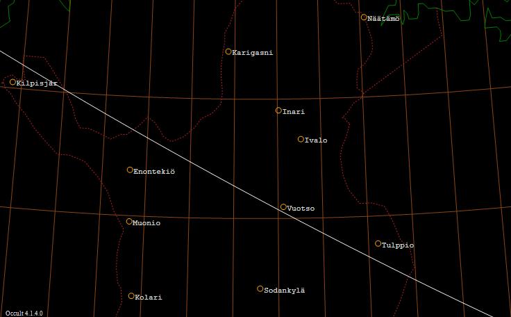 Tähti ZC 0675 (5,6 mag) sivuaa Kuun eteläistä reunaa Enontekiön Lossujärven ja Sallan Tuntsan kautta kulkevan viivan kohdalla.