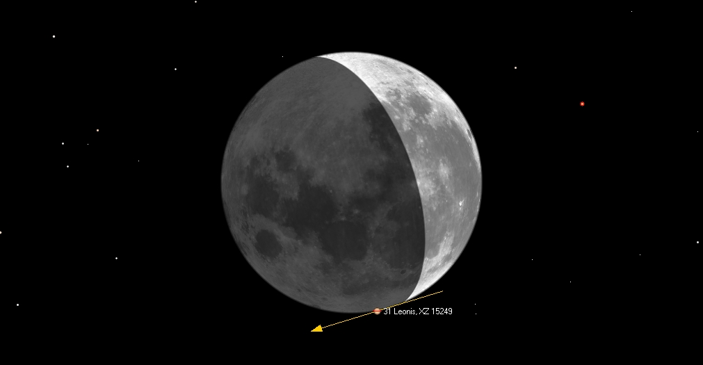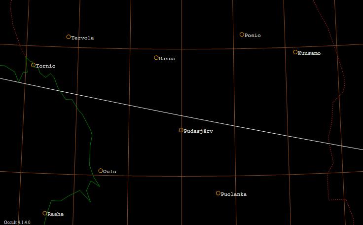 Tähti ZC 1486 (31 Leonis, 4,4 mag) sivuaa Kuun pohjoista reunaa Tornion ja Pudasjärven kautta kulkevan
