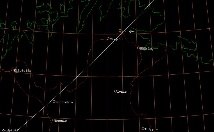 Tähti ZC 3313 (6,5 mag) sivuaa Kuun pohjoista reunaa Enontekiön ja Utsjoen kautta kulkevan viivan kohdalla.