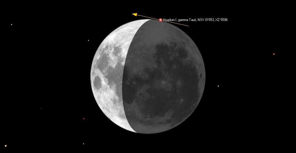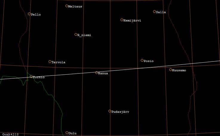 γ Tauri (ZC 0635, 3,7 mag) sivuaa Kuun pohjoista reunaa Tornion ja Kuusamon kautta kulkevan viivan kohdalla.