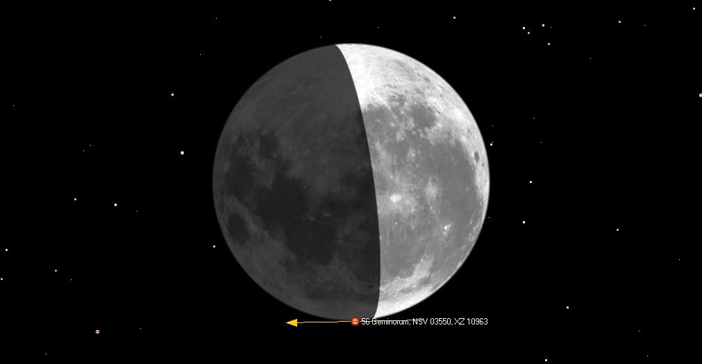 56 Geminorum (ZC 1113, 5,1 mag) sivuaa Kuun pohjoista reunaa Merikarvian ja Joensuun kautta