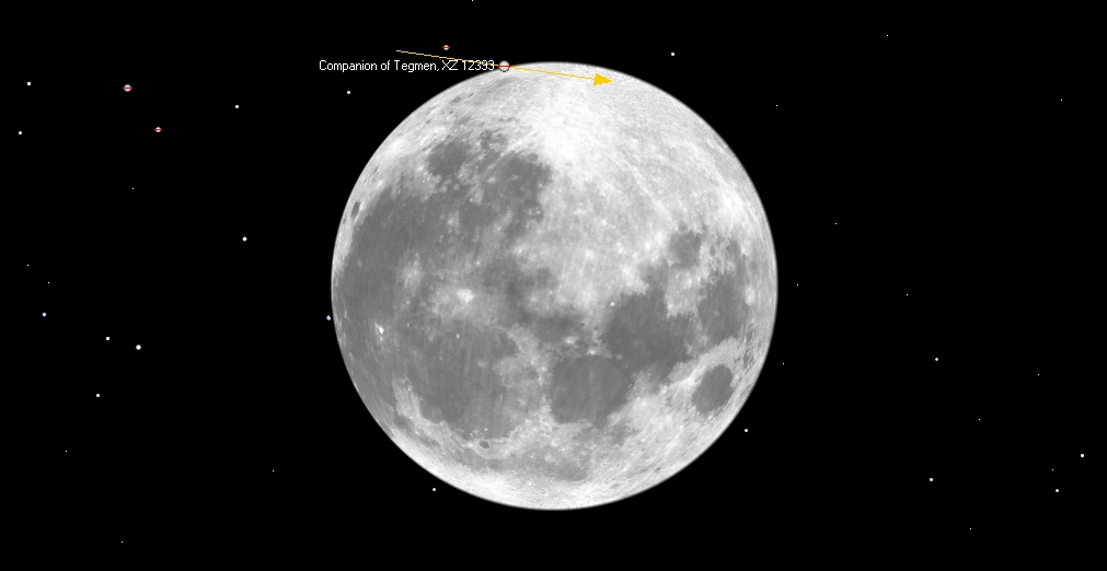 Viivan eteläpuolella tähti ohittaa Kuun. Kuun pohjoisnapa on kääntynyt 2,4 astetta Maahan päin.