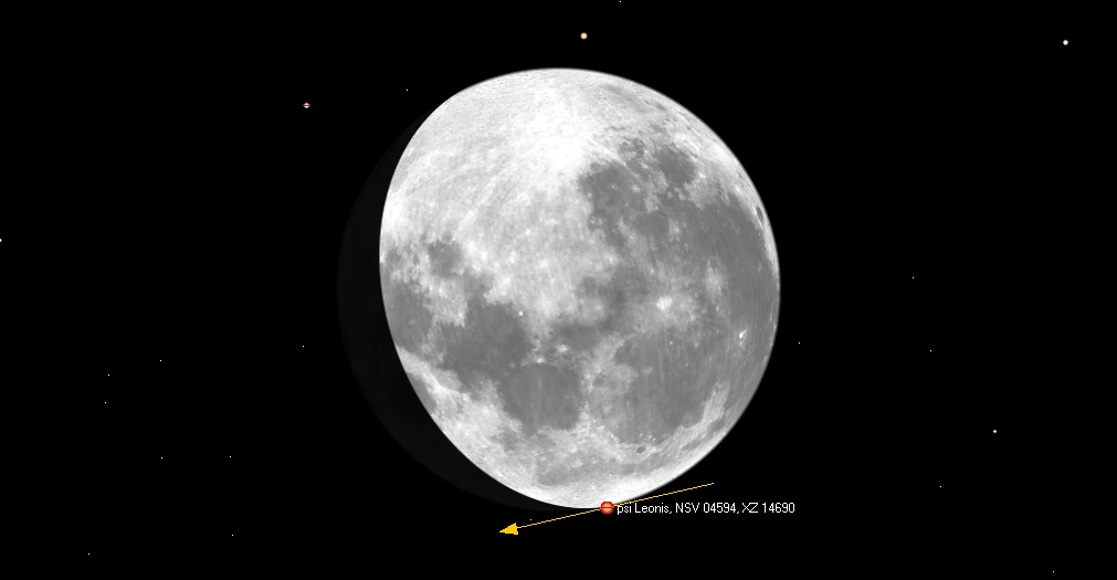 ψ Leonis (ZC 1434, 5,4 mag) sivuaa Kuun pohjoista reunaa Vaasan ja Iisalmen kautta kulkevan viivan kohdalla.