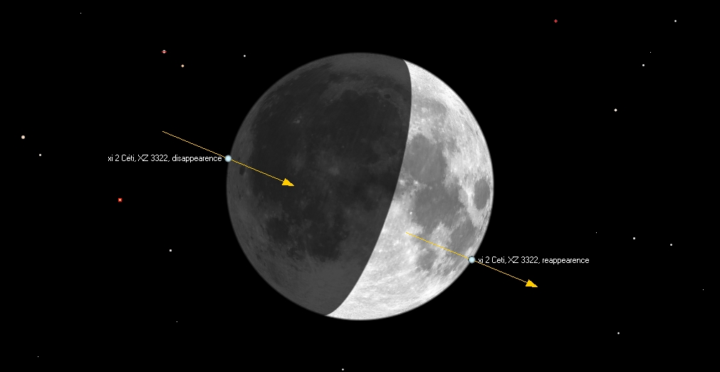 ZC 0364, ξ 2 Ceti, 4,3 mag peittyy Kajaanissa 11.02.2019 kello 18.27.23 ja tulee esiin klo 19.36.21