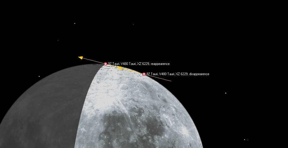 97 Tauri (ZC 0730, 5,1 mag) -tähti sivuaa Kuun eteläistä reunaa Ylitornion ja Nellimin välisellä linjalla.