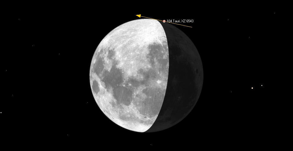 104 Tauri (ZC 0764, 4,9 mag) sivuaa Kuun eteläistä reunaa Porin ja Kuopion välisellä linjalla. Pienimmät etäisyydet
