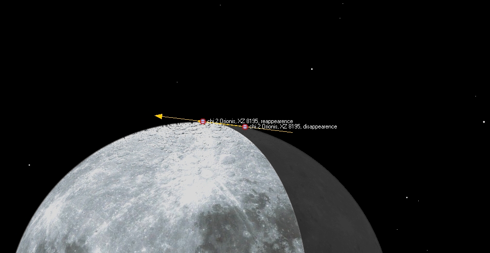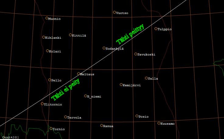 χ 2 Orionis (ZC 0915, 4,6 mag) -tähden sivuaa Kuun eteläistä reunaa Ylitornion ja Tulppion välisellä