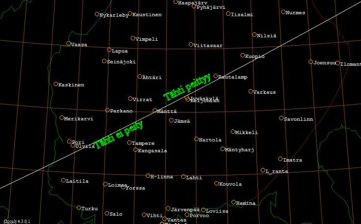 tarvitaan 20 cm:n läpimittainen kaukoputki. Kuu on sivuamisviivalla 36 - 40 asteen korkeudella kaakkoisella taivaalla.