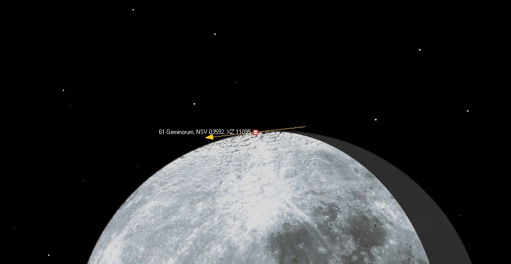 61 Geminorum (ZC 1127, 5,9 mag) sivuaa Kuun eteläistä reunaa Kilpisjärven ja Kuusamon välisellä linjalla.