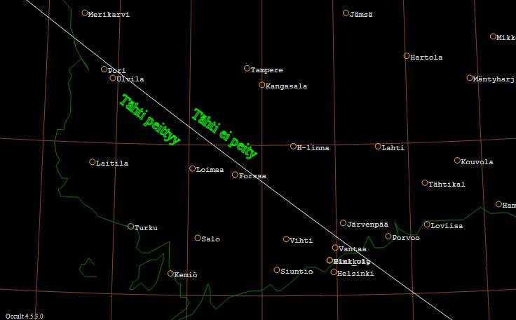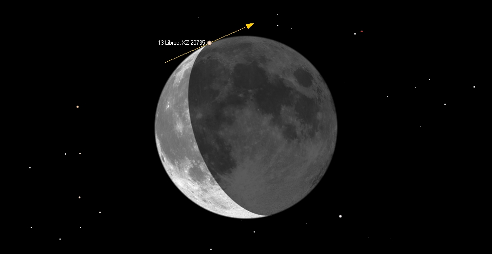 13 Librae -tähti (ZC 2128, 5,8 mag) sivuaa Kuun pohjoista reunaa Porin ja Vantaan välisellä linjalla.