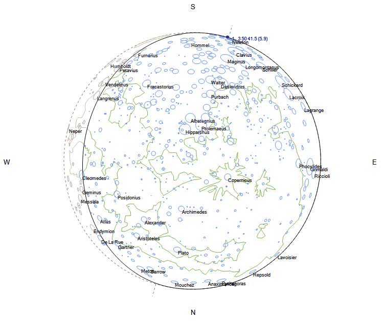 libraatio on negatiivinen eli eteläinen. Newton on kaukana reunasta ja Plato on
