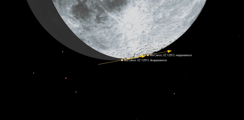 η Cancri (ZC 1277, 5,3 mag) sivuaa Kuun eteläistä reunaa Tornion ja Ranuan välisellä viivalla. Pienimmät