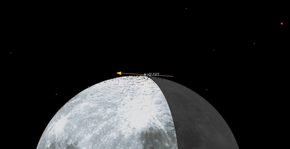 Viivan pohjoispuolella tähti ohittaa Kuun. Kuun pohjoisnapa on kääntynyt 0,5 astetta Maasta pois päin. Kuusta näkyy