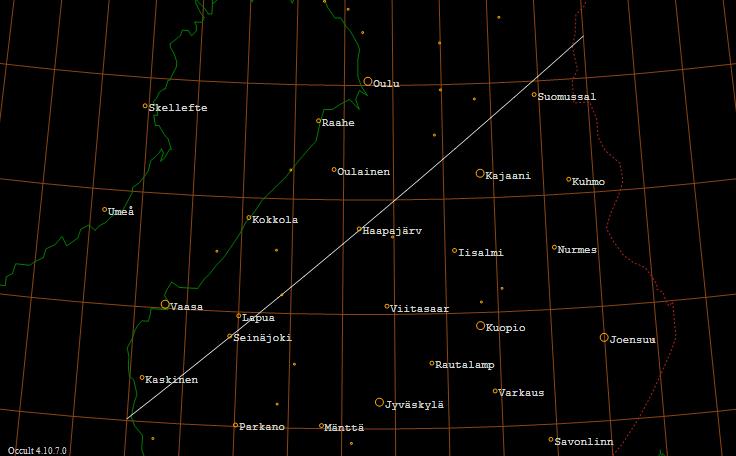 tarvitaan 20 cm:n läpimittainen kaukoputki. Kuu on sivuamisviivalla 30−34 asteen korkeudella eteläisellä