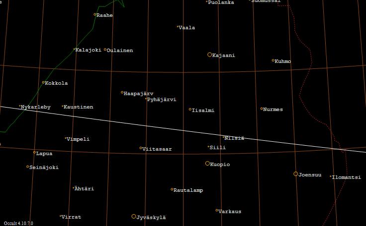 22 H1. Tauri (ZC 0534, 6,1 mag) sivuaa Kuun pohjoista reunaa Uusikarlepyyn ja Nilsiän välisellä linjalla. Pienimmät