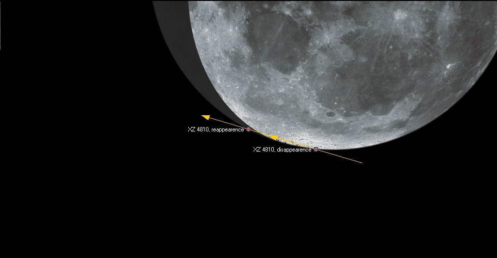 Viivan pohjoispuolella tähti ohittaa Kuun. Kuun pohjoisnapa on kääntynyt 1,2 astetta Maasta poispäin. Kuusta