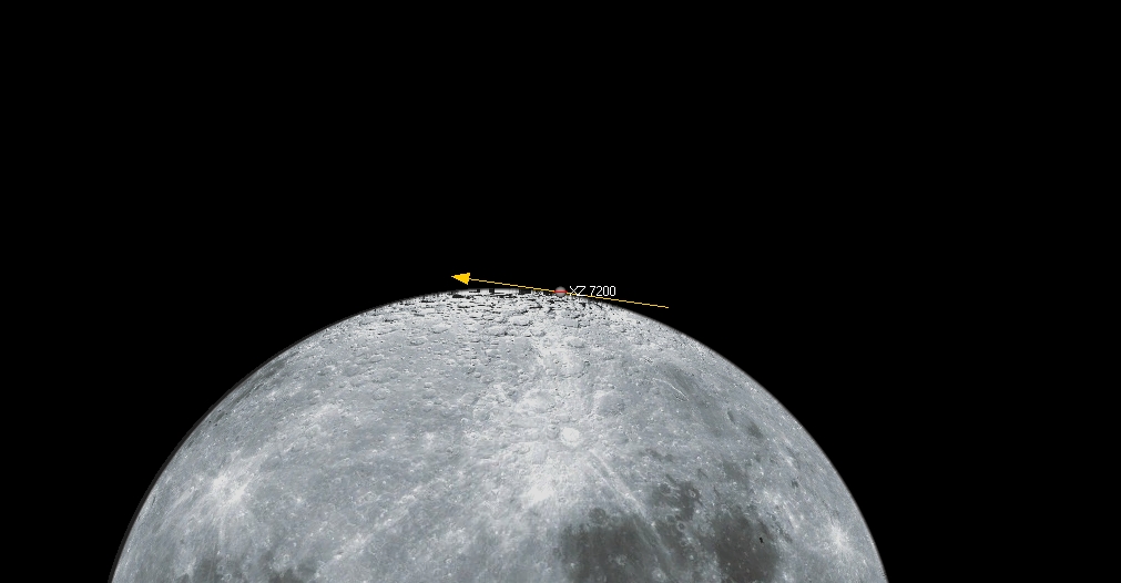 Viivan eteläpuolella tähti ohittaa Kuun. Kuun pohjoisnapa on kääntynyt 3,9 astetta Maasta poispäin. Kuusta näkyy 99