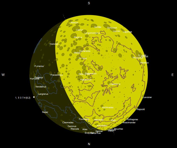 Kuu 23.03.2021. Näemme Kuun itäisen reunan taakse. Pituusasteen suuntainen