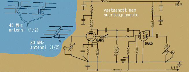 Tämä teleskooppi oli silloin maailmassa ainutlaatuinen radioastronomian tutkimuslaite. Peilin polttopisteessä tukivarsien päässä oli syöttötorvi ja vastaanotin. Oikeastaan "vastaanotin" oli pelkkä 5-asteinen RF-putkivahvistin, jonka kaistanleveys 160 MHz:lll oli 1 MHz (myöh. 0,19 MHz) ja vahvistus 90 dB (1 000 000 000-kertainen). Vahvistettu RF-signaali (galaktinen kohina) tasasuunnattiin putkidiodilla. Siitä kohinatehoa indikoiva mittaussignaali siirtyi tasajännitteenä koaksiaalijohtoa myöten talon kellariin, jossa olivat virtalähdeosa ja piirturi. Muiden taajuusalueiden vastaanottimissa oli eri määrä vahvistinasteita, mutta rakenne oli muuten sama. 480 MHz:n vastaanottimen kohinaluku oli 6,5 dB.