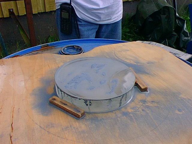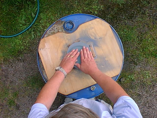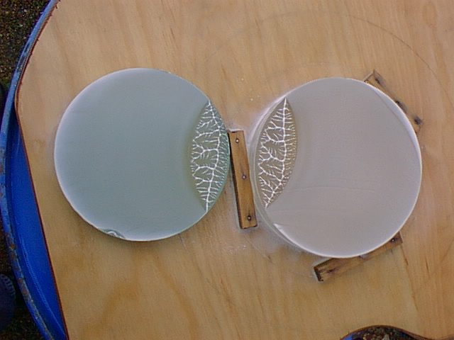 Työn tarkastelua hionnan edistyessä. Alemmassa sarjassa Jouni Sorvali mittaa peilin muotoa.