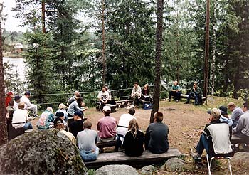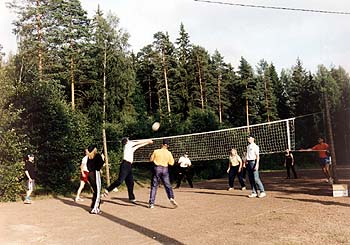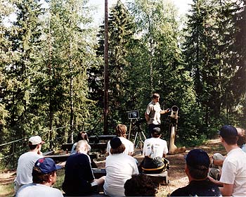 ...bittipaikka...Peilinhionnan ihmeellisyyksistä juopunut ensikertalaisemme NN jatkaa matkaansa ja sukeltaa viereisestä ovesta saunatuvan puolelle: -Ahaa, tietokoneita. Tuttua puuhaa. Tietotekniikkapaja keräsi mukavan määrän sekä vierailijoita että koneitakin. Paikalle oli tuotu pari kannettavaa sekä muutama pöytämallinen tietokone. Suosiota saavuttivat suomalaisten tähtiharrastuksen kotisivujen "virtuaali-internet" zip-levykkeen muodossa ja Ursan ohjelmarekisterin cd-rom-versio "Mizar CD-ROM". -Ja siellä missä on tietokoneita siellä on verkko, näin olisi saattanut luulla Kari Laihian ajatelleen verkottaessaan paikalle tuomansa kaksi konetta. ...ja pilkuista...– Uusi päivä, uudet kujeet, ajattelee NN tukevien yöuniensa sekä maittavan aamiaisen jälkeen ja suunnistaa päärakennuksen edustalla olevaan Auringon havaitsemispisteeseen. Aurinkojaoston järjestämä havaintopiste muodostui heti suosituksi tapahtumaksi. Havaintolaitteita oli tarjolla aina pienestä linssiputkesta 20 cm:n teleskooppiin asti. Osanottajien arviot auringonpilkkuluvun määrästä vaihtelivat tosin hilpeän tuntuisesti peräti 46:n ja 106:n välillä. Auringon protuberansseja pääsi vilkuilemaan Juhani Salmen laitteella.