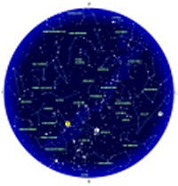 Tähtitaivaan asento Helsingissä 26.1.2002 klo 21. Kuun (K) ja planeettojen Jupiter (J), Saturnus (S) ja Mars (M) paikat on merkitty karttaan. Huomaa Jupiterin sijainti aivan Kuun takana. Kartta: Hannu Karttunen / Ursa Lataa painokelpoinen kuva. |