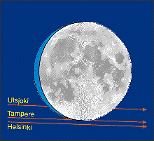 Vyöhyke, jolla Jupiter peittyy Kuun taakse vain osittain. Vyöhykkeen pohjoispuolella planeetta katoaa kokonaan ja eteläpuolella jää Kuun reunan alapuolelle. Kuva: Veikko Mäkelä / Ursa Lataa painokelpoinen kuva värillisenä tai mustavalkoisena.