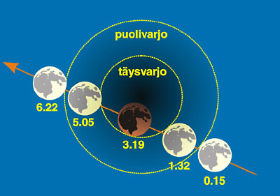 Kuva 1. Kuunpimennyksen eteneminen 9.11.2003. Huomaa, että kuvaan merkittyä täys- ja puolivarjoa ei näy taivaalla.