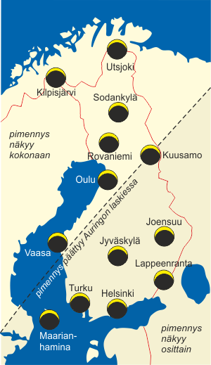 Osittaisen auringonpimennyksen alku-, maksimi- ja loppuhetken kellonajat, Auringon keskipisteen korkeus (kork.) kullakin hetkellä sekä pimennyksen suuruus prosenteissa Auringon kiekon halkaisijasta (%) joillekin paikkakunnille Suomessa.