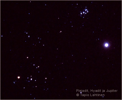 objektiivi. Kuvassa kirkas Jupiter loistaa Hyadien ja Plejadien