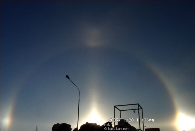 Harvinaisen kirkas sivuaurinkonäytelmä. Paljain silmin näkyi lisäksi vain osa 22 asteen renkaasta mutta kamera näki paremmin.