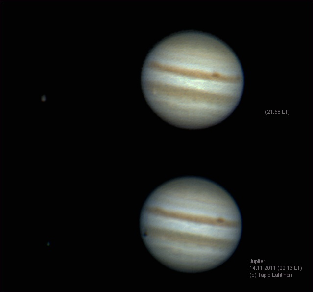 ja vasemmalla Ganymede. Alemmassa kuvassa tummana Ion varjo.