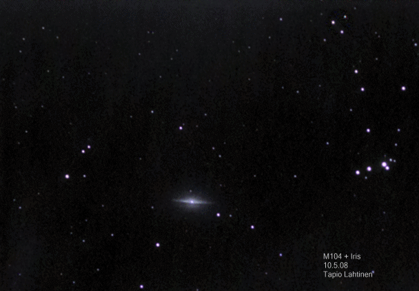 Iris-asteroidin ja M104-galaksin 'lähiohitusta' (etäisyyttä