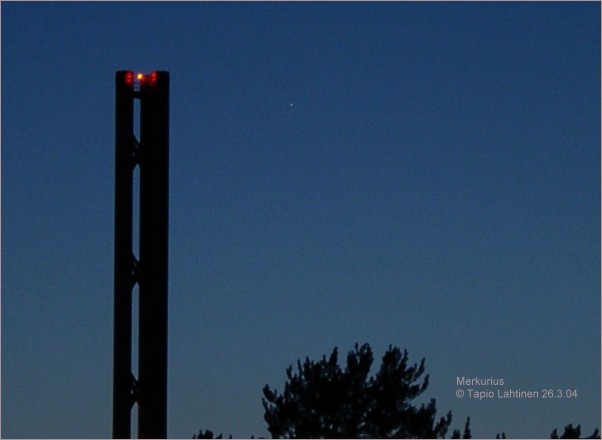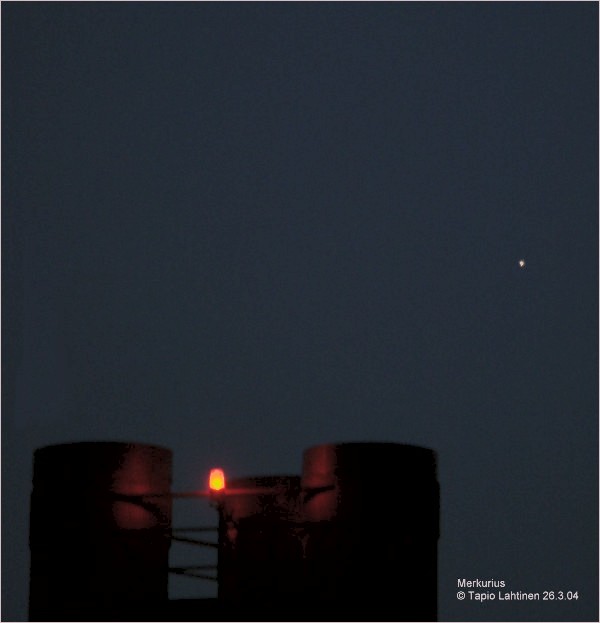 Merkurius näkyy piipun kärjestä oikealle valopisteenä.