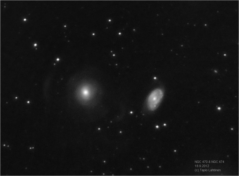 Pääsin pimeän paikan leirille Hauholle ja siellä sitten kuvasin muutamaa kohdetta jotka olivat havaintokauteni ohjelmassa. Tämän galaksiparin löysin alunperin Skyhound-sivuston suosituslistalta. NGC 474 on siis ns 'kuorigalaksi' (Shell galaxy), jossa pidemmissä