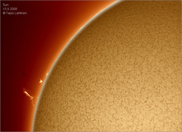 Pikaotos auringosta. Pintaan pinottu 30/100 kuvaa ja protuberansseihin 60/300 kuvaa.