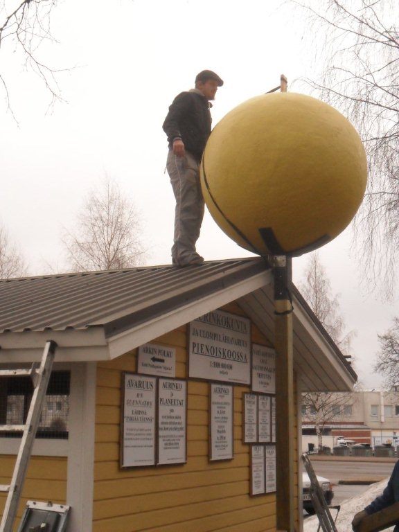 Halley-85:n Veli-Pekka Savela 12.4.2014 asentamassa rakentamaansa 1,4 m kokoista Aurinkoa Saarijärven lukion pihalla. Auringosta alkava Arkin polku, avaruus miljardisosamittakaavassa, jatkuu lukiolta Puuhapuisto Veijariin, jossa on kääpiöplaneetta Pluto. (kuva: Ensio Saarela)