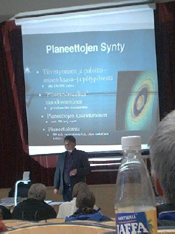 Esitelmätarjonta keskittyi lauantaille. Ensimmäisenä oli Geodeettisen laitoksen professori Markku Poutasen esitelmä planeetta Maasta, joka oli lähes sanasta sanaan sama kuin edellisenä tiistaina Kirkkonummella pidetty. Markku Poutanen on koulutukseltaan tähtitieteilijä, joka on aikaisemmin työskennellyt planeettatutkijana Helsingin yliopiston Tähtitieteen laitoksella. Esitelmää kuunteli lähes 60 henkeä.
