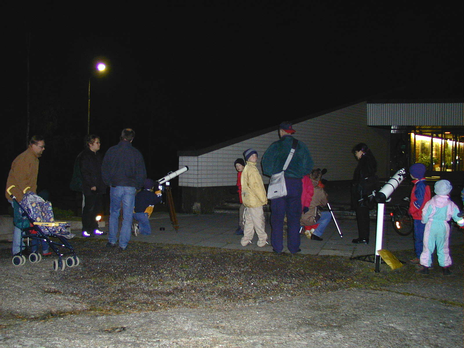 Harrastustarinoinnin jälkeen Junkkari esitti diasarjan aurinkokunnastamme. Esitys tuntui kiinostavan niin aikuisia kuin lapsiakin, jotka esittivät myös planeettoja koskevia kysymyksiä. Komeettalaiset olivat tuoneet mukanaan useita kaukoputkia, osa itse tehtyjä. Niihin väki saattoi tutustua ensiksi sisätiloissa. Myöhemmin kaukoputket kannettiin pihalle, missä sää oli kirkastunut kuin tilauksesta.
