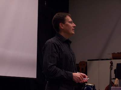 Professori Esa Kallio esitelmöi Kirkkonummella. Kuva Seppo Linnaluoto.