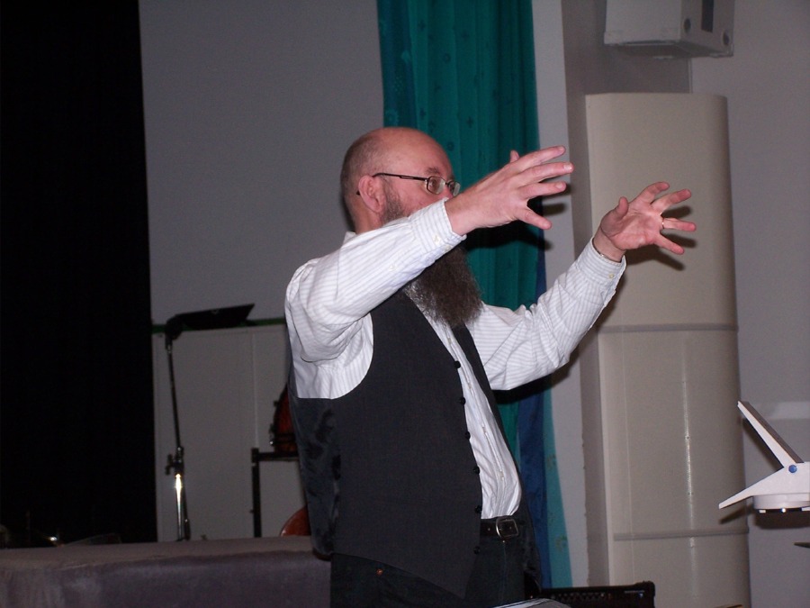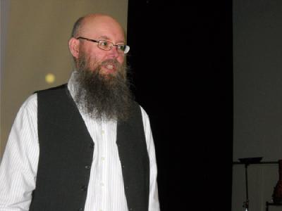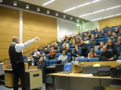 Professori Esko Valtaoja esitelmöi Kirkkonummella. Kuva Seppo Linnaluoto.