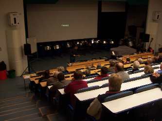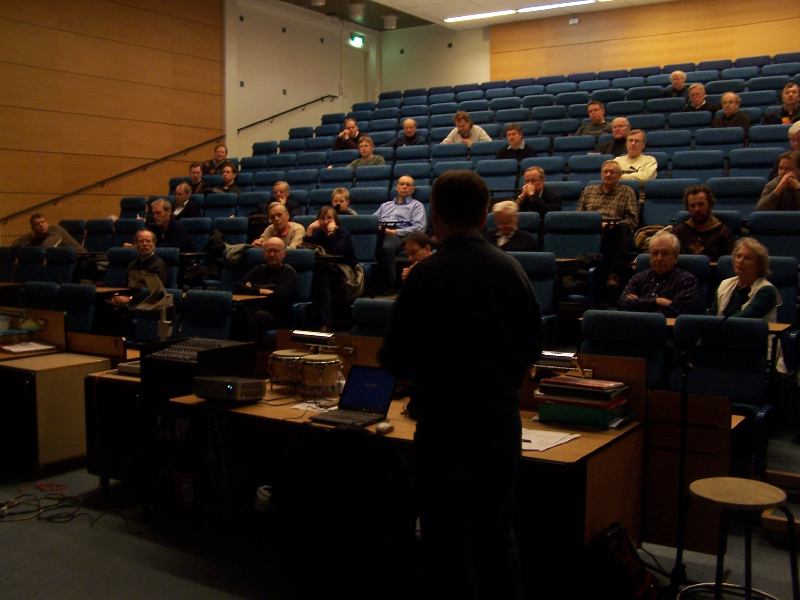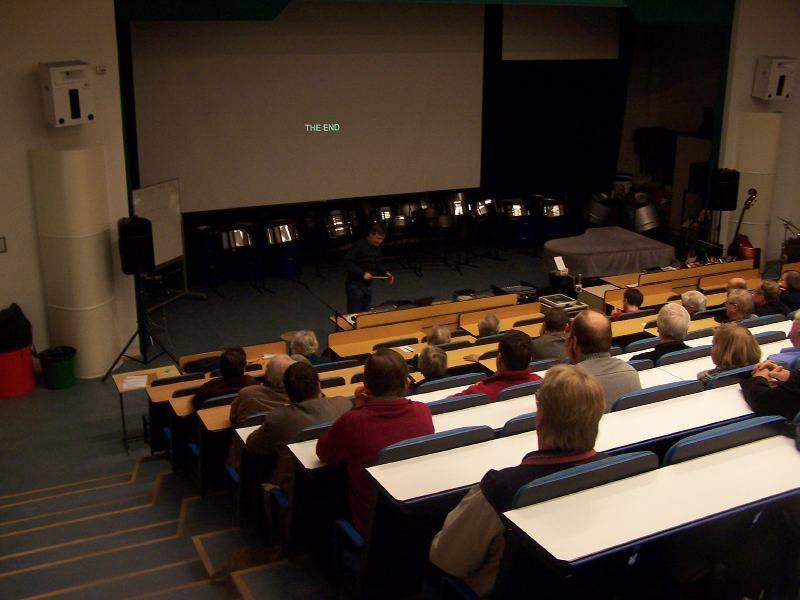 Dosentti Hannu Kurki-Suonio esitelmöi Kirkkonummella taustasäteilystä.