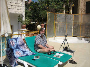 Edellisenä päivänä etsiskelimme sopivaa katselupaikkaa. Mutta puolta tuntia ennen pimennyksen alkua keksimme, että katsomme pimennystä oman hotellimme uima-altaalta! Ja sinne veimme sitten varusteemme. Uima-altaalla ei ollut ketään muuta paitsi uima-altaan baarin myyjä.