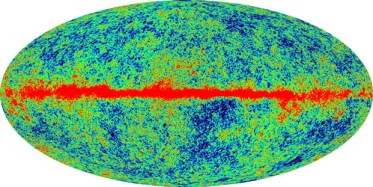 WMAP-satelliitin kuva maailmankaikkeuden taustasäteilystä. Kuva NASA.