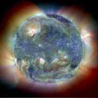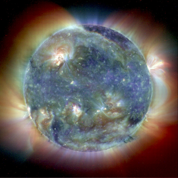 yhdistelmä kolmesta Auringon ultraviolettikuvasta. Kuva SOHO.