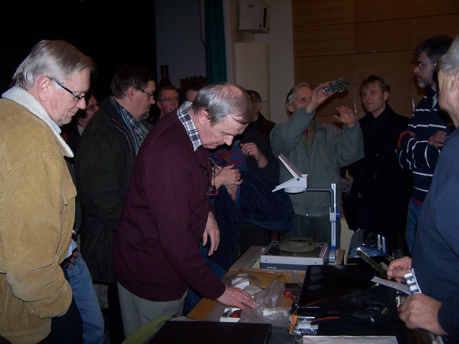 Esitelmän jälkeen meteoriitteja katsottiin tarkemmin. Kuva Seppo