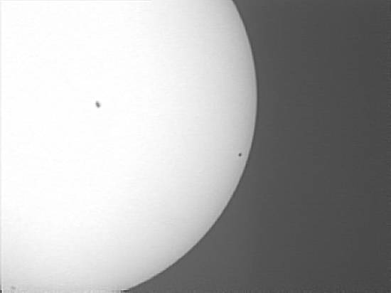 Heti klo 8.11:n jälkeen Merkurius ilmestyi pienenä mustana pilkkuna Auringon reunalle. Merkuriuksen koko oli vain 12 kaarisekuntia, kun Auringon koko oli 1900 kaarisekuntia.