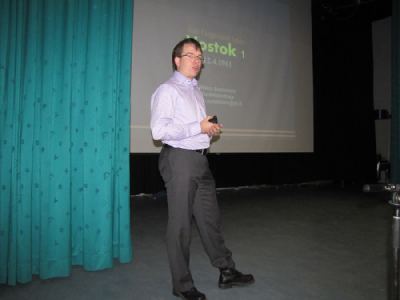 Mikko Suominen esitelmöi Kirkkonummella. Kuva Seppo Linnaluoto.